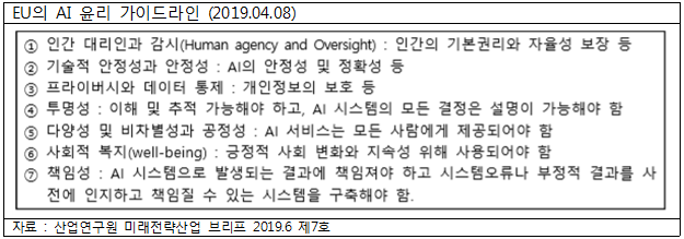 EU 유럽위원회는 2019년 4월 인공지능에 대한 신뢰성 제고를 위한 ’AI 윤리 가이드라인‘(Ethics Guidelines for Trustworthy AI)을 제시하였다. EU는 법률적 강제성은 없지만 AI 개발시 7가지 조건을 충족해야 한다는 내용의 ’AI 윤리 가이드라인‘을 발표(’19.4.8)하며 정부차원의 지침을 처음 마련하였다. AI는 인간의 자율성을 보장해야 하며, 사람들이 AI에 의해 조작되어서는 안되고 소프트웨어가 내리는 모든 결정에 인간이 개입 할 수 있어야 함을 명시하고 있다.