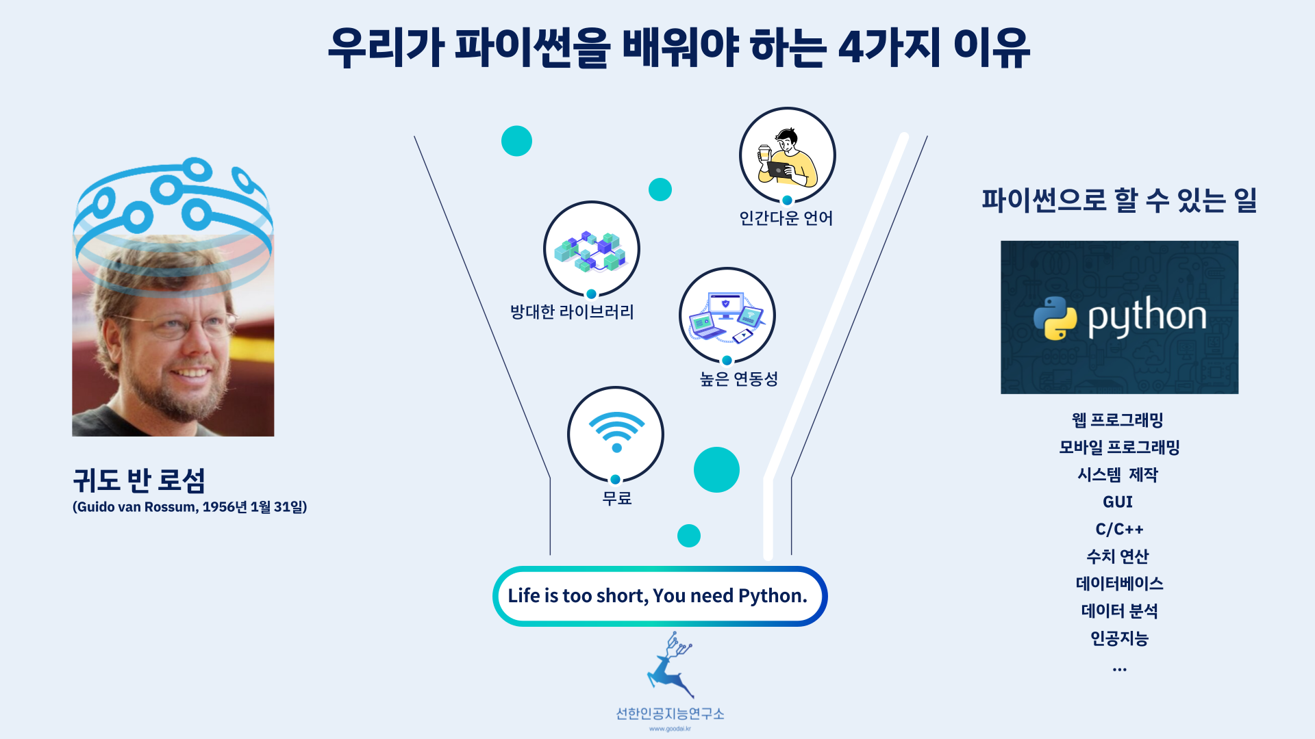 인공지능 시대에 사는 우리들을 위해 파이썬(Python)은 꼭 배워야 할 프로그래밍 언어입니다.